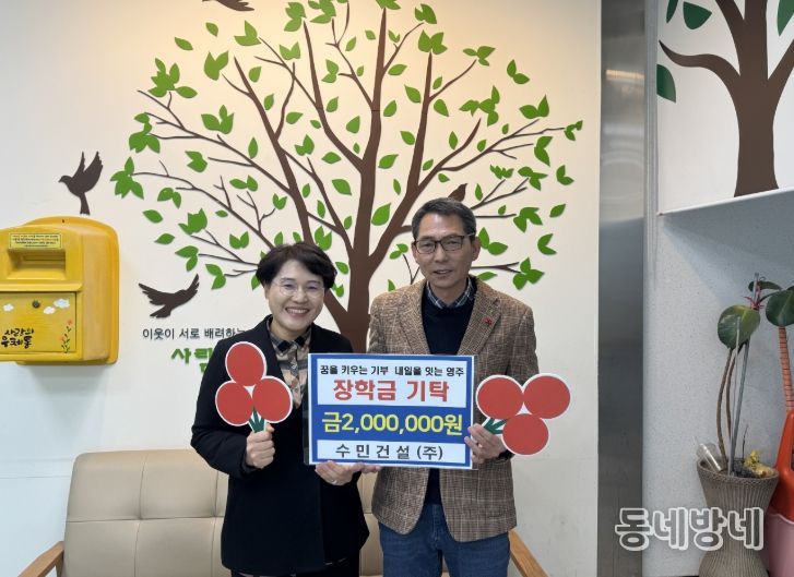 동네방네 김형규 기자 | 영주시 수민건설 주식회사(대표 김효식)는 지난 20일 가흥1동 행정복지센터(동장 안순기)를 방문해 새로운 세상을 향해 첫발을 내딛는 예비 대학생을 위한 ‘응원 장학금’ 200만 원을 기탁했다.