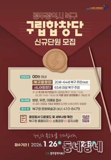 동네방네 김형규 기자 | 광주광역시 북구가 아름다운 목소리로 주민들과 소통하는 구립합창단 신규 단원을 모집한다고 21일 밝혔다.