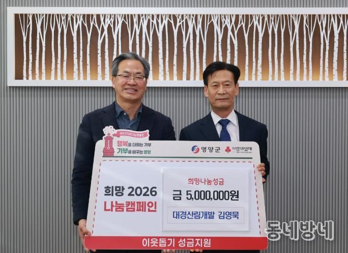 동네방네 김형규 기자 | 대경산림개발 대표 김영묵(전 농업경제건설국장)은 1월 21일 영양군을 방문해 지역의 어려운 이웃과 희망을 나누고자 성금 500만원을 기부하며 '희망2026나눔캠페인'에 동참했다.