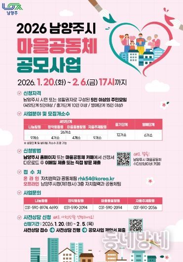 동네방네 김형규 기자 | 남양주시는 1월 20일부터 2월 6일까지 ‘2026년 마을공동체 공모사업’참여 공동체를 공개 모집한다.