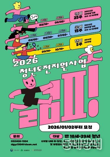 동네방네 김형규 기자 | 대구광역시는 취업에 어려움을 겪고 있는 청년들의 구직 의욕과 자신감 회복, 취업역량 강화를 위해 청년도전지원사업 ‘젊핑’ 중기과정(15주) 시즌1 참여자 50명을 선착순 모집하고 있다.