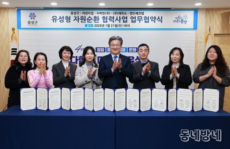 이번 협약은 어린이집과 기업이 협력해 고품질 재활용 자원을 회수하고, 새활용제품 소비와 체험 활동으로 연계하는 선순환 체계를 구축하기 위해 마련됐으며, 대전어린이집연합회 유성구지회·수퍼빈㈜·㈜재작소·앤드에코랩 등 8개 기관이 참여했다.