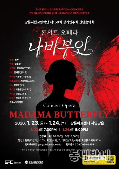 동네방네 김형규 기자 | 강릉시립교향악단은 2026년의 첫 정기연주회로 오는 23일(금) 19시 30분, 24일(토) 17시 강릉아트센터 사임당홀에서 콘서트 오페라‘나비부인’을 선보인다.