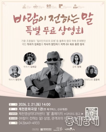동네방네 김형규 기자 | 제천문화재단이 오는 2월 21일 오후 2시, 제천문화극장 (의병대로18길 1)에서 양희 감독과 출연진이 함께 하는 '바람이 전하는 말' 특별 무료 상영회를 개최한다.
