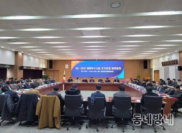 도는 23일 도청 대회의실에서 신일호 안전기획관 주재로, 도 관련 부서 및 시군 과장들이 참석한 가운데 ‘재해복구사업 조기 추진 대책회의’를 개최했다.