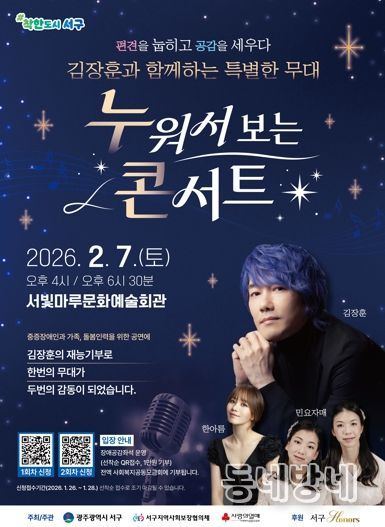 동네방네 김형규 기자 | 광주광역시 서구가 문화 향유의 기회로부터 소외되기 쉬운 중증장애인을 위해 ‘공연장의 문턱’을 낮췄다. 서구는 가수 김장훈과 고액 기부자 모임 ‘서구아너스’와 함께 오는 2월7일 서빛마루문화예술회관에서 배리어프리 공연 ‘김장훈의 누워서 보는 콘서트’를 개최한다고 밝혔다.