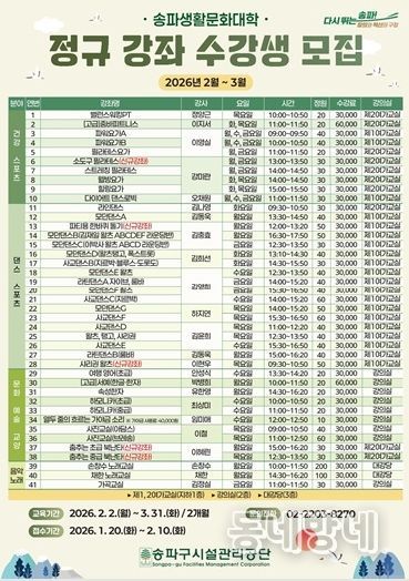 수강 접수 기간은 기존 수강생은 1월 27일까지, 신규 수강생은 1월 29일부터 2월 3일까지 순차 진행된다. 신청은 송파구시설관리공단 홈페이지 온라인 접수 또는 송파문화예술회관 1층 생활문화대학 사무실 방문을 통해 가능하다.