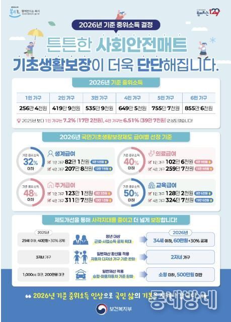 2026년 기준 중위소득이 4인 가구 기준 전년 대비 6.51% 인상됨에 따라, 생계·의료·주거·교육급여 등 국민기초생활보장 급여 수준도 함께 상향 조정된다.