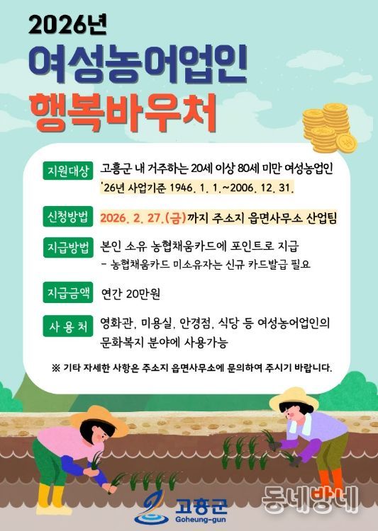 동네방네 김형규 기자 | 고흥군은 여성 농어업인의 문화·여가 활동을 돕기 위해 ‘2026년 여성농어업인 행복바우처 지원사업’ 신청을 오는 2월 27일까지 주소지 읍·면사무소에서 접수한다고 밝혔다.