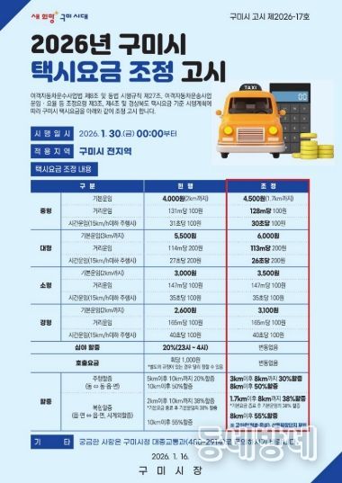 구미시 관계자는 “이번 요금 조정은 어려운 경제 여건 속에서도 택시업계의 경영 안정화를 위해 불가피하게 일부 조정이 됐으며, 요금 인상에 맞춰 택시종사자들의 서비스가 함께 개선될 수 있도록 최선을 다하겠다”고 밝혔다.