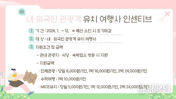 지원 금액은 단체관광 기준으로 당일 관광 시 1인당 8천 원, 1박 1만6천 원, 2박 2만4천 원이며, 수학여행은 1박 기준 1인당 1만 원이 지원된다.