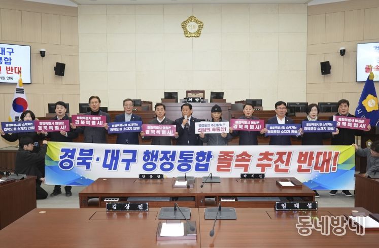 동네방네 김형규 기자 | 안동시의회가 27일 오후 2시 의회청사 본회의장에서 의원 전원이 참석한 가운데 경상북도와 대구광역시가 발표한‘행정통합 중단 없는 추진 합의’에 대해 강력한 유감을 표명하며, 경북 북부권의 진정한 균형발전 대책이 선행되지 않은 행정통합에 대해 결사반대한다는 성명서를 발표했다.