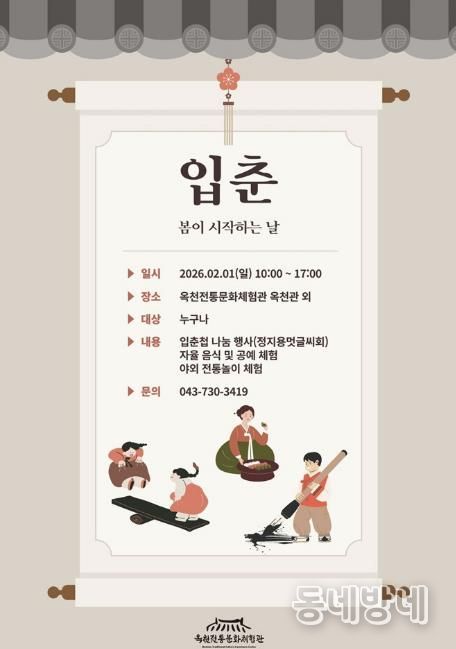 동네방네 김형규 기자 | 옥천전통문화체험관은 우리 고유의 전통 세시풍속인 입춘(立春, 양력 2월 4일경)을 맞아 오는 2월 1일(일) ‘입춘 맞이 행사’를 개최한다.