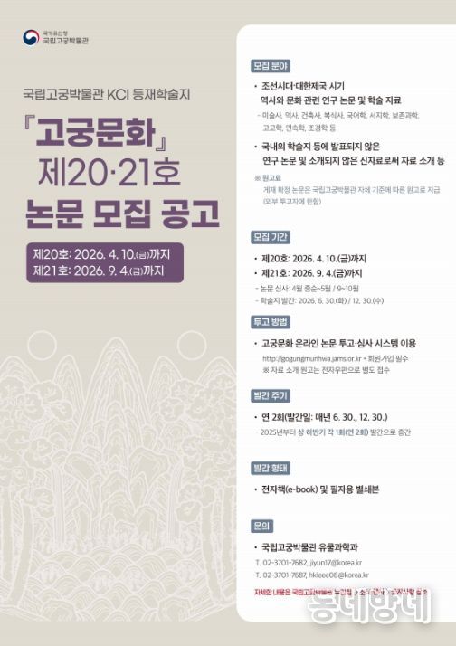 동네방네 김형규 기자 | 국가유산청 국립고궁박물관은 조선시대와 대한제국기의 역사·문화 연구를 활성화하기 위해 박물관에서 매년 발간하는 학술지 『고궁문화』 제20호와 제21호에 수록할 논문을 모집한다. 제20호는 올해 6월 30일, 제21호는 12월 30일 발간 예정이며, 논문 접수 마감일은 각각 4월 10일과 9월 4일이다.