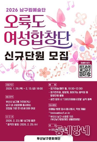 동네방네 김형규 기자 | (재)부산남구문화재단은 남구립 오륙도여성합창단의 2026년 신규 합창단원을 1월 29일부터 2월 13일까지 공개 모집한다고 밝혔다.