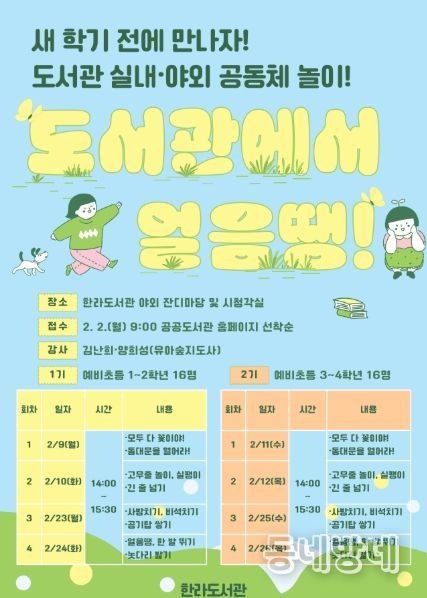 한라도서관은 9일부터 26일까지 예비 초등학교 1~4학년을 대상으로 어린이 공동체 놀이 프로그램 ‘도서관에서 얼음땡!’을 운영한다.