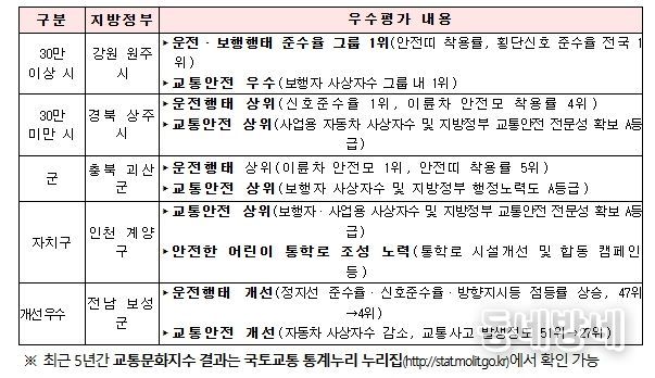 ’25년 교통문화지수 조사 결과, 강원 원주시(91.58점, 인구 30만 이상 시), 경북 상주시(87.62점, 인구 30만 미만 시), 충북 괴산군(88.72점, 군 지역), 인천 계양구(89.56점, 자치구)가 각각 1위로 선정됐다.