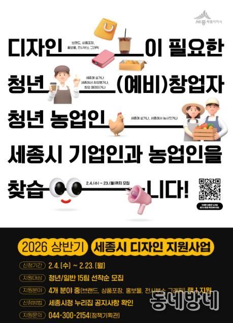 동네방네 김형규 기자 | 세종특별자치시가 4일부터 오는 23일까지 지역 기업의 맞춤형 디자인 개발을 돕는 ‘2026년 상반기 세종시 디자인 지원사업’ 참여 기업을 모집한다고 밝혔다.