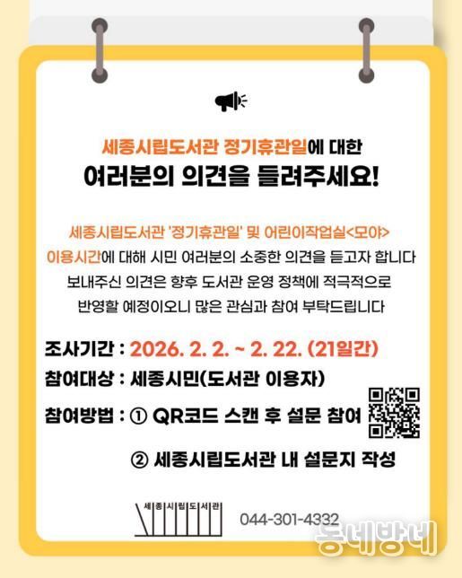 동네방네 김형규 기자 | 세종시립도서관이 도서관 운영 방향에 대한 시민의 목소리를 듣기 위해 오는 22일까지 시민 의견 조사를 진행한다.