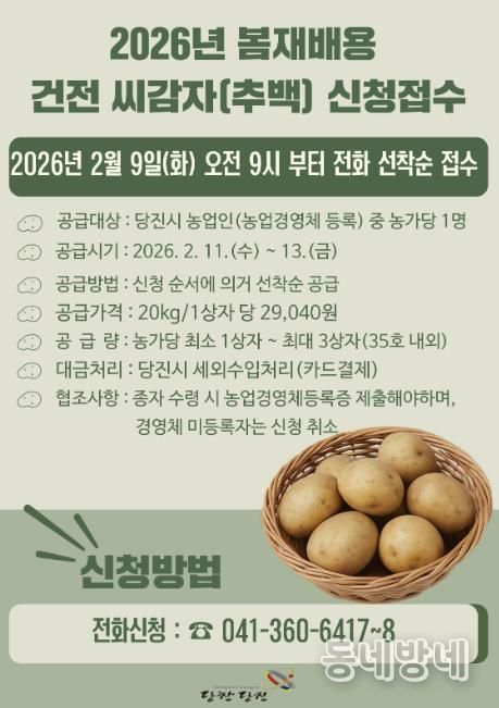 동네방네 김형규 기자 | 당진시는 봄 재배용으로 활용될 조직배양 ‘추백’ 씨감자 원종 2톤을 관내 농가에 공급하기 위해 오는 9일 오전 9시부터 선착순으로 신청을 받는다고 3일 밝혔다.