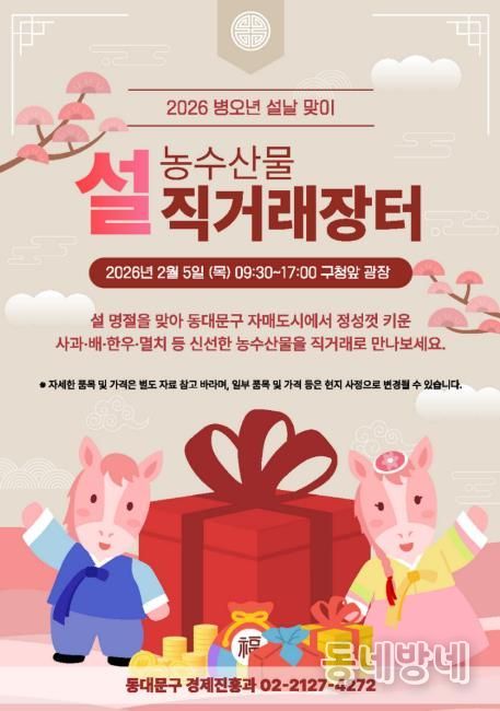 동네방네 김형규 기자 | 동대문구가 5일 오전 9시 30분부터 오후 5시까지 구청 앞 미래광장에서 설 농수산물 직거래 장터를 연다.