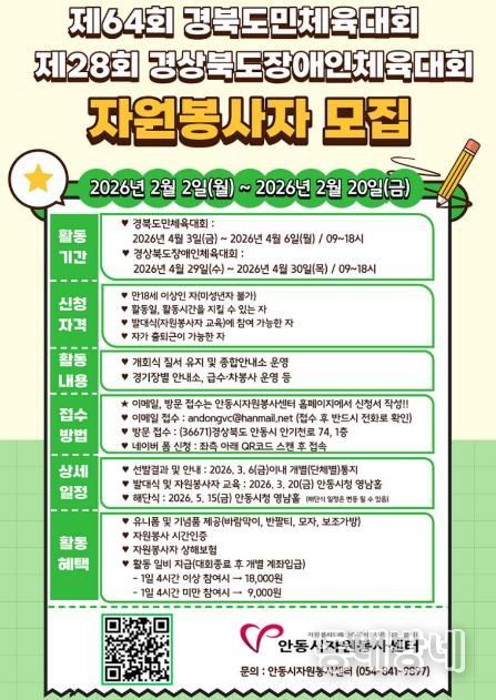 선발된 자원봉사자에게는 자원봉사 실적 인정 및 활동 실비와 유니폼이 지급되며, 발대식은 오는 3월 20일 안동시민회관 영남홀에서 개최돼 자원봉사 대표자 선서식과 사전교육이 이뤄질 예정이다.