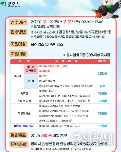 동네방네 김형규 기자 | 영주시는 오는 2월 13일부터 27일까지 관내 음식업소와 숙박업소를 대상으 ‘2026년 관광서비스 시설환경개선사업’ 참여 업체를 모집한다.