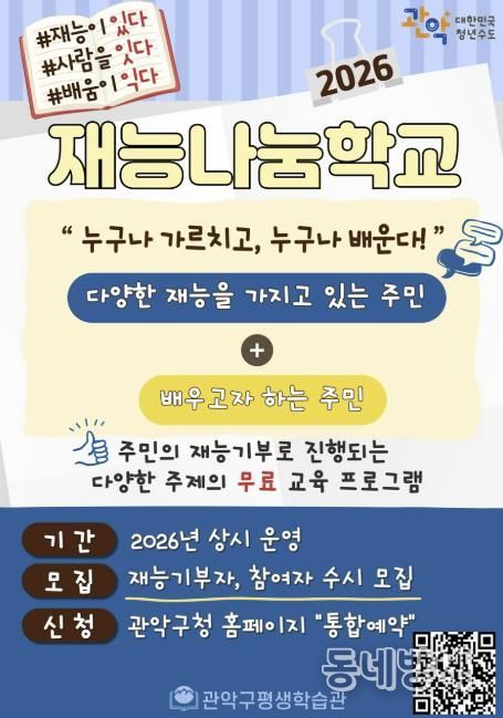 동네방네 김형규 기자 | 관악구가 이웃과 재능을 나누며 지역사회의 소통을 이끄는 ‘재능나눔학교’를 상시 운영한다.