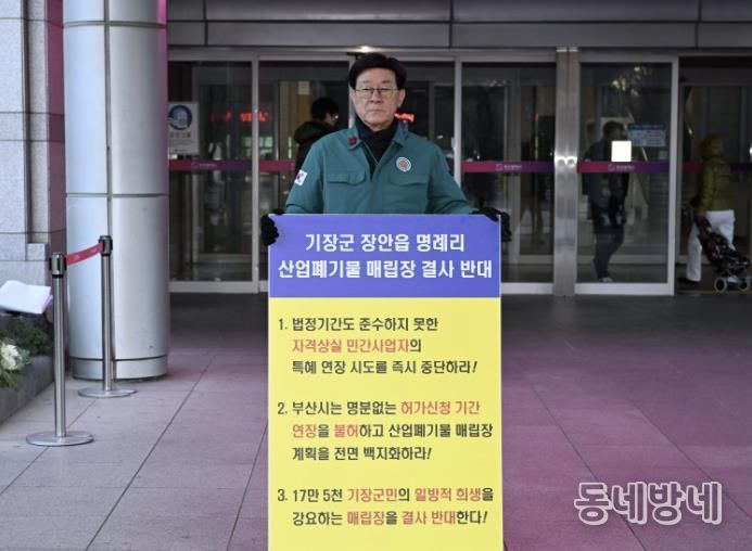 동네방네 김형규 기자 | 기장군은 장안읍 명례리 일원 대규모 산업폐기물 매립장 건립과 관련해 사업자의 허가신청 기간 만료가 임박함에 따라, 3일 정종복 기장군수가 부산시청을 직접 방문해 매립장 사업계획 백지화를 촉구하는 1인 시위를 진행했다고 밝혔다.