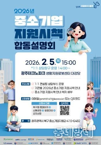 4일 북구에 따르면 오는 5일 오후 3시 광주테크노파크 생활지원로봇센터 대강당에서 ‘2026년 중소기업 지원시책 합동설명회’가 개최된다.