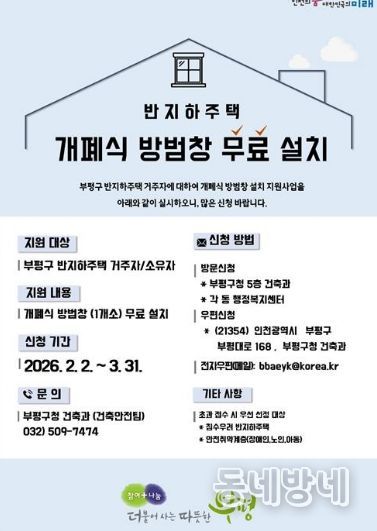 동네방네 김형규 기자 | 부평구가 오는 3월 31일까지 지역 내 반지하주택을 대상으로 ‘2026년 개폐식 방범창 설치 지원사업’ 신청을 받는다고 밝혔다.