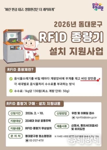 동네방네 김형규 기자 | 동대문구는 음식물류 폐기물을 줄이고 쾌적한 주거환경을 만들기 위해 ‘2026년 공동주택 음식물 쓰레기 RFID 종량기 설치 지원 사업’을 확대 추진한다.