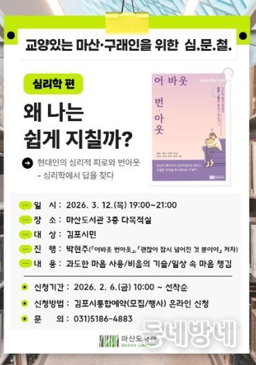 동네방네 김형규 기자 | 김포시 마산도서관은 심리적 피로와 번아웃을 주제로 한 인문교양 강연 '왜 나는 쉽게 지칠까?'를 오는 3월 12일 오후 7시부터 9시까지 마산도서관 3층 다목적실에서 운영한다.