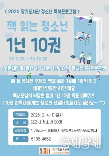 동네방네 김형규 기자 | 김포시 장기도서관은 청소년의 자발적인 독서 습관 형성을 위해 청소년 특화프로그램 ‘책 읽는 청소년 1년 10권’을 오는 2월 23일부터 연말까지 운영한다.