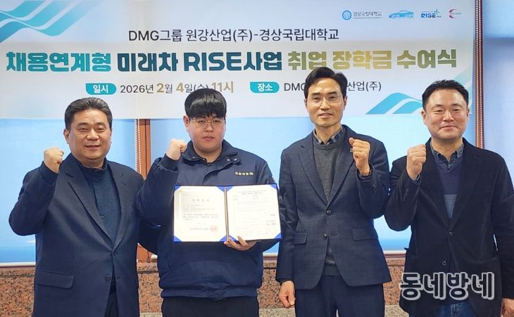 동네방네 김형규 기자 | 경상국립대학교는 2월 4일 오전 11시 함안군에 소재한 원강산업(주) 회의실에서 ‘채용연계형 미래차 RISE사업 취업 장학금 수여식’을 개최했다.