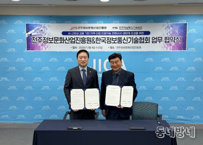 동네방네 김형규 기자 | 전주시 출연기관인 전주정보문화산업진흥원은 4일 진흥원 멀티미디어기술지원센터 1층 세미나실에서 한국정보통신기술협회와 AI 신뢰성 검증 기반 지역 산업 인공지능 디지털 전환(AX) 생태계 조성을 위한 업무협약을 체결했다.