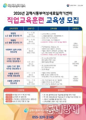 동네방네 김형규 기자 | (재)김해시복지재단 동부여성새로일하기센터는 여성들의 취·창업 역량을 강화하고 지역사회의 특성과 시대적 흐름에 맞춘 여성 특화 직업교육훈련 과정의 교육생을 지난 2일부터 모집한다고 밝혔다.