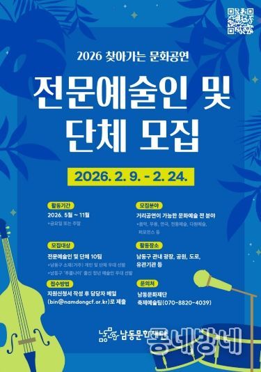 동네방네 김형규 기자 | 인천시 남동구 남동문화재단은 지역 곳곳을 무대로 펼쳐지는 ‘2026 찾아가는 문화공연’에 참여할 공연 전문예술인 및 단체를 오는 9~24일까지 공개 모집한다고 5일 밝혔다.