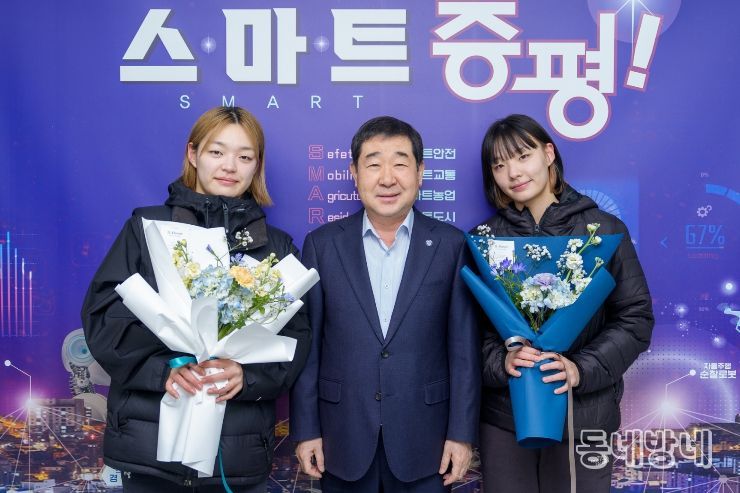 동네방네 김형규 기자 | 충북 증평군은 6일 군수 접견실에서 제23회 전국장애인동계체육대회 컬링 종목에서 은메달을 획득한 서은지·서은주 선수를 초청해 축하와 격려의 시간을 가졌다.
