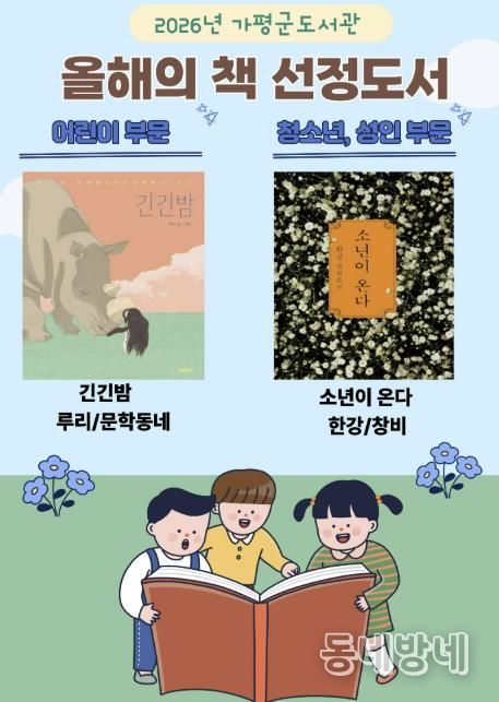 동네방네 김형규 기자 | 가평군도서관이 군민의 독서 문화 확산을 위해 ‘2026년 올해의 책’으로 루리 작가의 『긴긴밤』과 한강 작가의 『소년이 온다』를 선정했다.