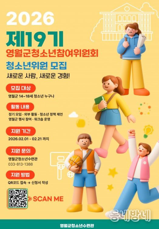 동네방네 김형규 기자 | 영월군청소년수련관은 관내 중~고등학교 청소년을 대상으로 오는 21일(토)까지 영월군청소년참여기구 신규, 연임 위원을 추가 모집한다.