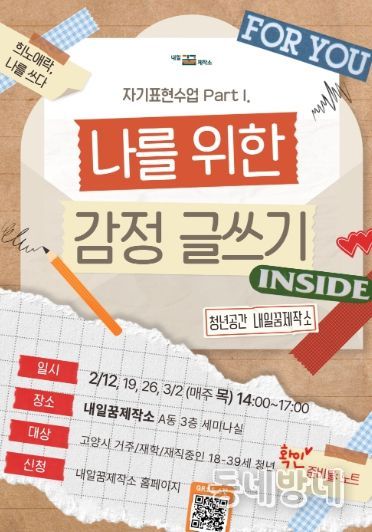동네방네 김형규 기자 | 고양특례시는 오는 2월 12일부터 매주 목요일 4주간, 고양시 청년공간‘내일꿈제작소’에서 관내 청년들의 마음돌봄을 위한‘감정글쓰기’프로그램을 진행한다고 밝혔다.