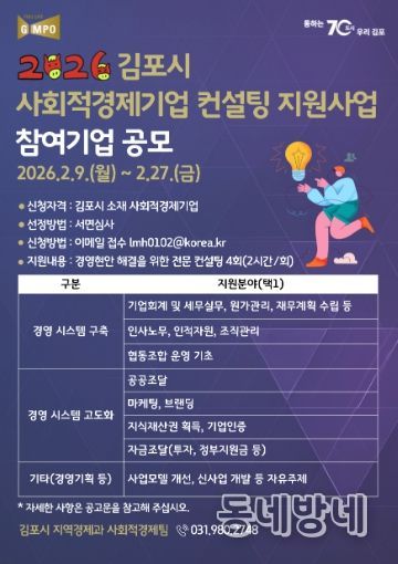동네방네 김형규 기자 | 김포시가 관내 사회적경제기업의 지속 가능한 성장과 자생력 강화를 위해 ‘사회적경제기업 역량강화 컨설팅 지원사업’ 참여기업을 오는 2월 27일까지 모집한다.