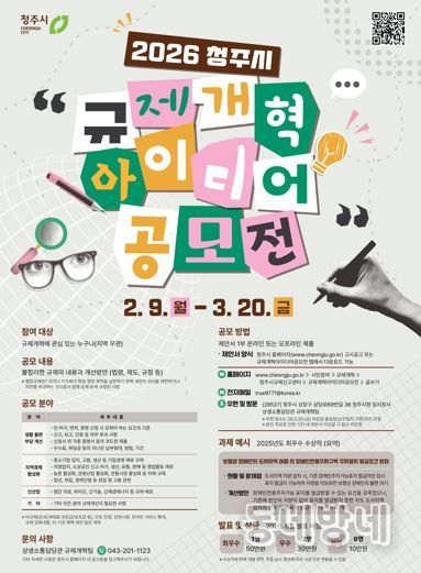 동네방네 김형규 기자 | 청주시는 시민이 체감할 수 있는 다양하고 창의적인 규제개혁 아이디어를 발굴해 일상생활과 경제활동을 제약하는 규제를 적극 개선하고자 ‘2026 청주시 규제개혁 아이디어 공모전’을 개최한다고 8일 밝혔다.
