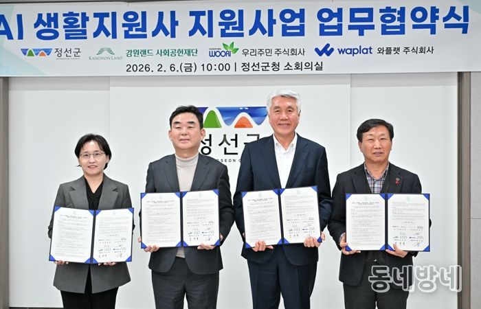 이번 협약식은 2월 6일 정선군청 소회의실에서 열렸으며, 정선군을 비롯해 강원랜드 사회공헌재단, 우리주민 주식회사, 와플랫 주식회사가 참석해 AI 기반 돌봄 서비스 제공과 통합돌봄 체계 구축을 위한 협력에 뜻을 모았다.