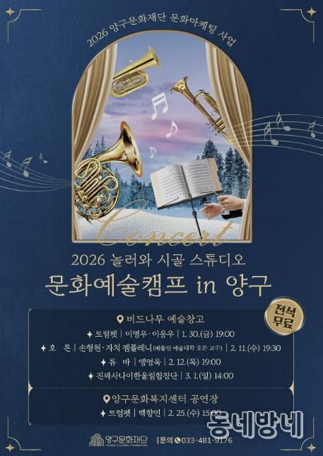 양구문화재단은 금관악기와 합창을 아우르는 릴레이 공연을 무료로 선보이며 군민들에게 다양한 문화 향유 기회를 제공할 계획이다. 공연 일정은 ▲2월 12일 오후 7시 ‘맹영욱(튜바) 팀 콘서트’(버드나무 예술창고) ▲2월 25일 오후 3시 ‘백향민(트럼펫) 팀 콘서트’(양구문화복지센터) ▲3월 1일 오후 2시 ‘진짜 사나이 한울림 합창단 공연’(버드나무 예술창고)이다.