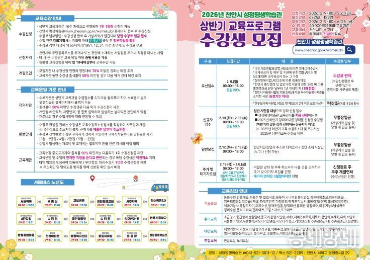 천안시 평생학습포털 누리집을 통해 온라인으로 접수하며, 모든 강좌는 선착순으로 마감된다.