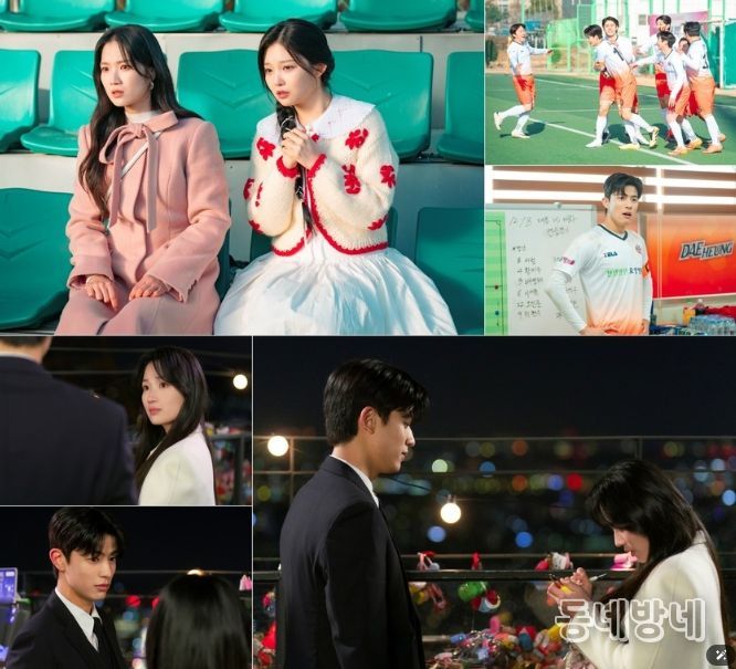 이로써 은호와 강시열의 로맨스 향방에 귀추가 주목되는 가운데, 이날 공개된 사진 속 ‘망생’ 탈출을 넘어 ‘망생’ 적응에 나선 두 사람의 모습이 흥미를 유발한다. 친구 현우석(장동주 분)과 운명이 바뀌면서, 해외 유명 구단에서 국내 4부 리그 소속이 된 강시열. 하지만 언젠가 되돌아갈 날만 꿈꾸며 ‘대흥시민구단’의 감독과 선수들, 유니폼조차 거들떠보지 않던 그가 필드로 다시 돌아온다. 왼팔에 두른 주장 완장은 물론, 경기장과 라커룸의 온도차 카리스마가 시선을 사로잡는다. 여기에 강시열의 ‘본업 모먼트’를 1열에서 직관 중인 은호와 팔미호도 눈길을 끈다. 두 손을 꼭 쥐고 조마조마한 표정으로 경기를 지켜보는 진심 가득한 응원 모드가 미소를 자아낸다.