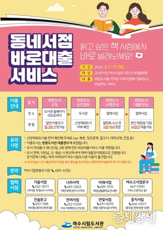 동네방네 김형규 기자 | 여수시는 시민들의 독서 접근성을 높이고 지역 서점과 상생을 도모하기 위해 ‘동네서점바로대출서비스’를 2월 1일부터 운영한다고 밝혔다.
