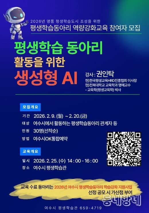 동네방네 김형규 기자 | 여수시가 평생학습동아리의 기획력과 운영 역량 강화를 위해 ‘평생학습동아리 활동을 위한 생성형 AI 역량강화교육’을 운영하고 참여자를 모집한다.
